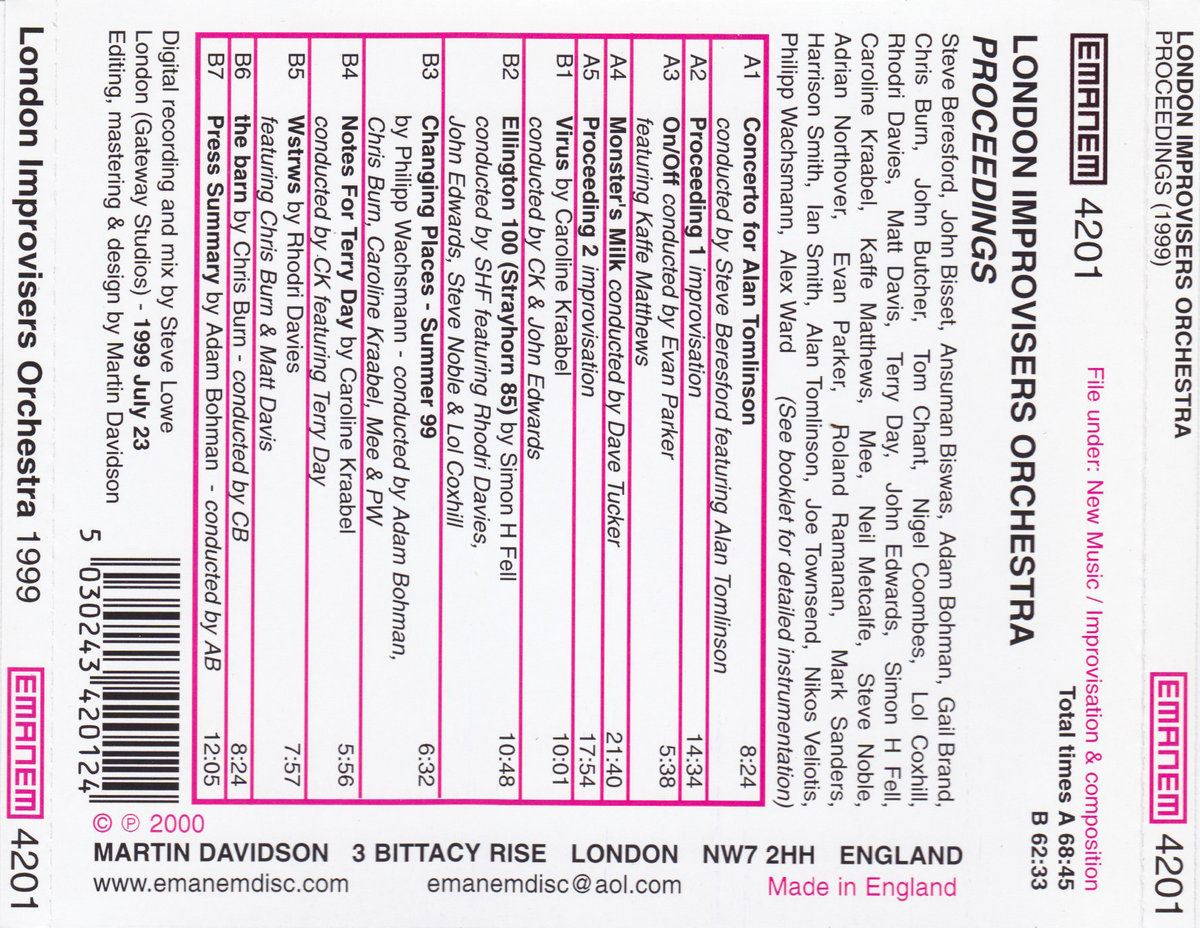 "The beauty of this project is illuminated by the collective free improvisation Proceeding 1, a minimalist ensemble dirge that builds into a microtonal crescendo as elongated lines overlap to sustain an intensifying organic structure of anarchic lyrical cells. The London Improvisers Orchestra proves that it is possible to expand the radical techniques of pioneers like Derek Bailey and Evan Parker and sustain them on a communal scale, a fantastic achievement that vindicates Charlie Parker's desire to have Edgard Varese design an orchestral score for him fifty years ago. Proceedings is a contemporary creative masterpiece . . . the life journey that brings me to appreciate the significance of the London Improvisers Orchestra involves an ongoing learning curve that numbers among the most vital and rewarding dimensions of my aesthetic experience." David Lewis CODA
